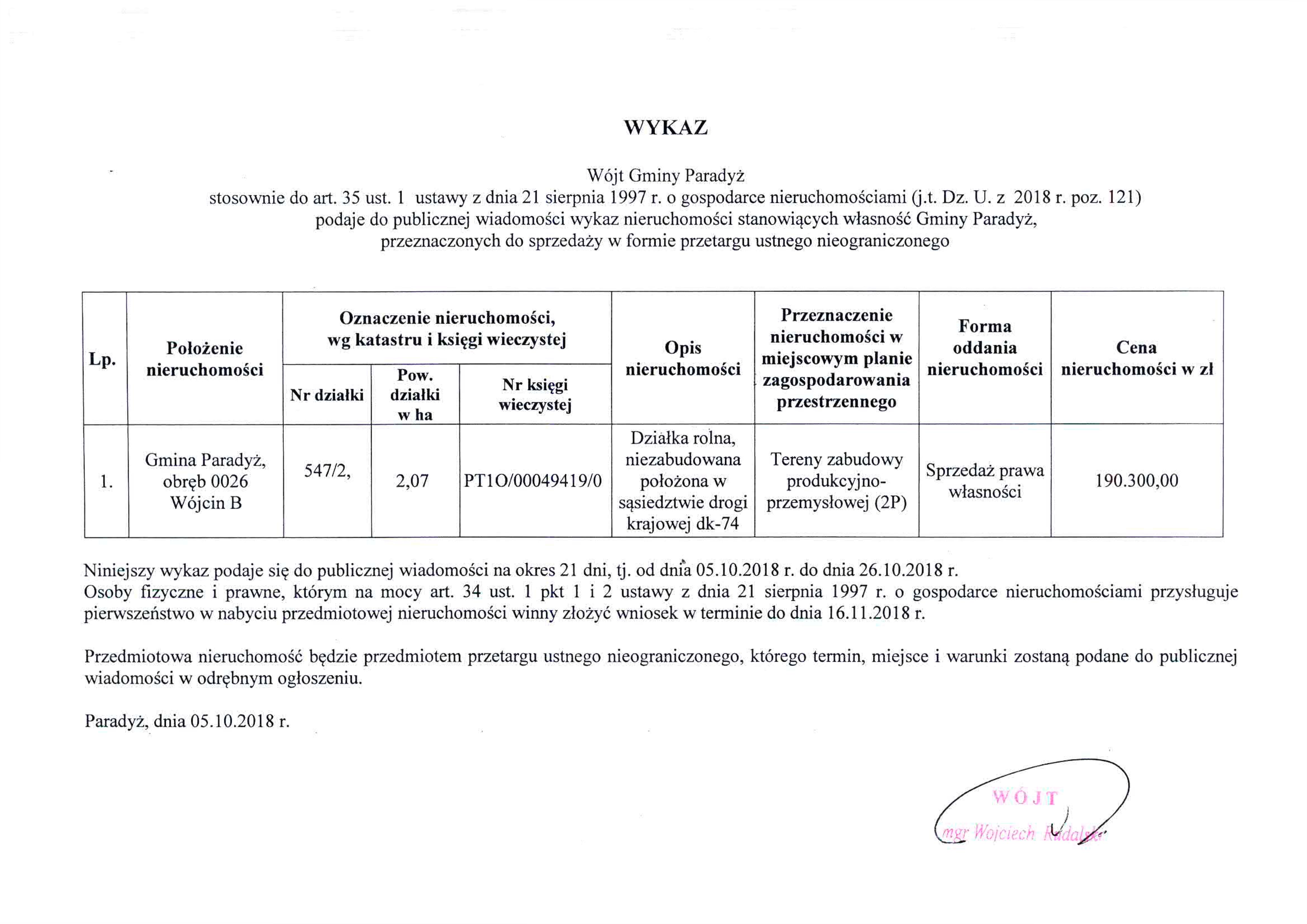 Zapraszam do obejrzenia strony „Wykaz nieruchomości przeznaczonych do sprzedaży. - 2018, menu 172, artykuł 309 - BIP - Gmina Paradyż”